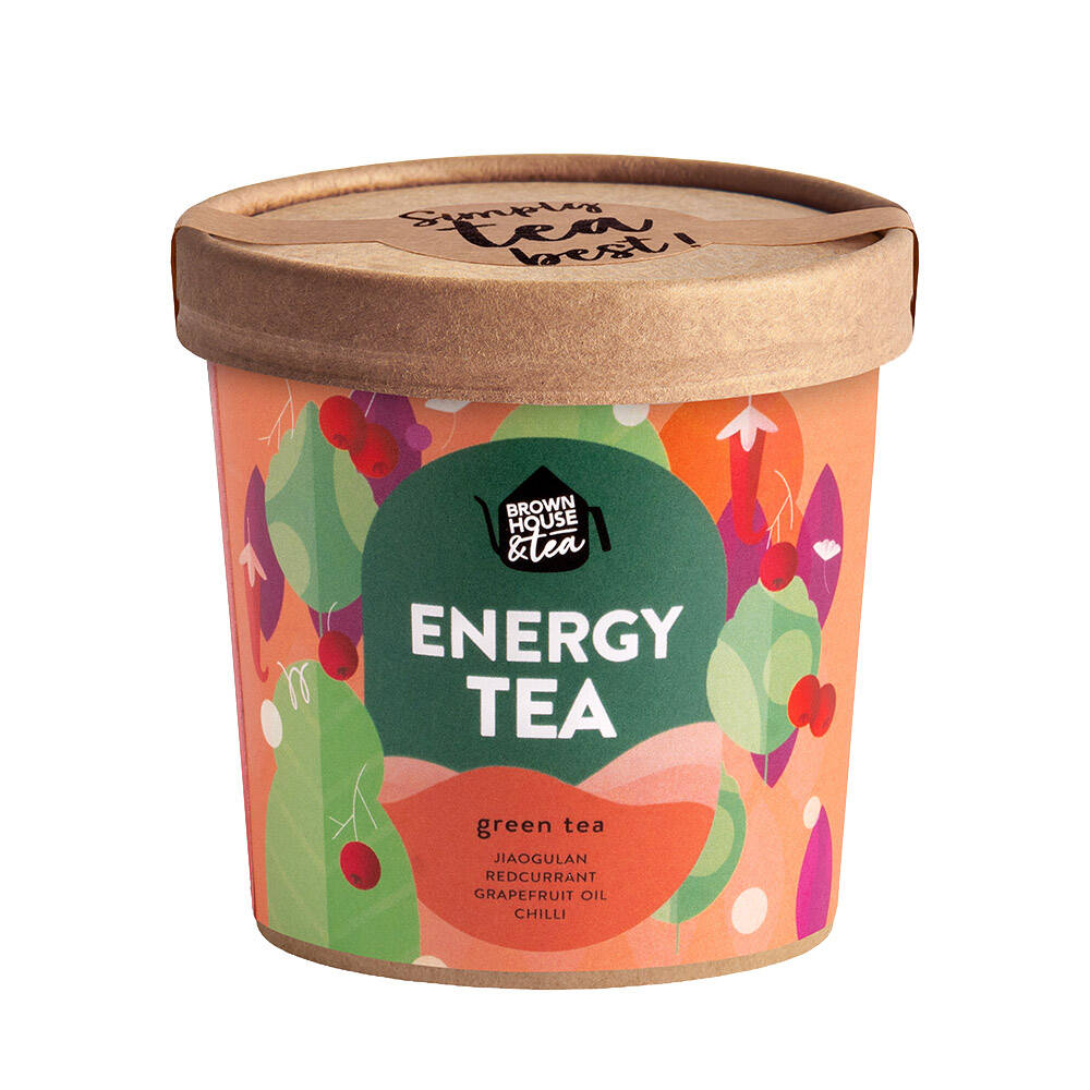 Zielona herbata z jiaogulanem Brown House & Tea Energy Tea 50g Energy Tea to autorska mieszanka na bazie zielonej herbaty typu sencha z ziołowymi i owocowymi dodatkami. Kompozycja została wzbogacona o takie składniki jak jiaogulan — zioło stosowane w tradycyjnej medycynie chińskiej, czerwona porzeczka, chilli, ziele pokrzywy, korzeń żeń szenia, korzeń galangalu i kwiaty czarnego bzu. Zielona herbata jest bogata w antyoksydanty, które m in.n. chronią nasz organizm przed nowotworami i ma teinę, czyli kofeinę, która wzmaga koncentrację i przemianę materii. Energy Tea ma delikatny smak z wyczuwalną nutą czerwonej porzeczki i ziół, które nadają herbacie charakteru i orzeźwiający lekko słodki wyraz. Energy Tea to wspaniała mieszanka na południowy zastrzyk energii.