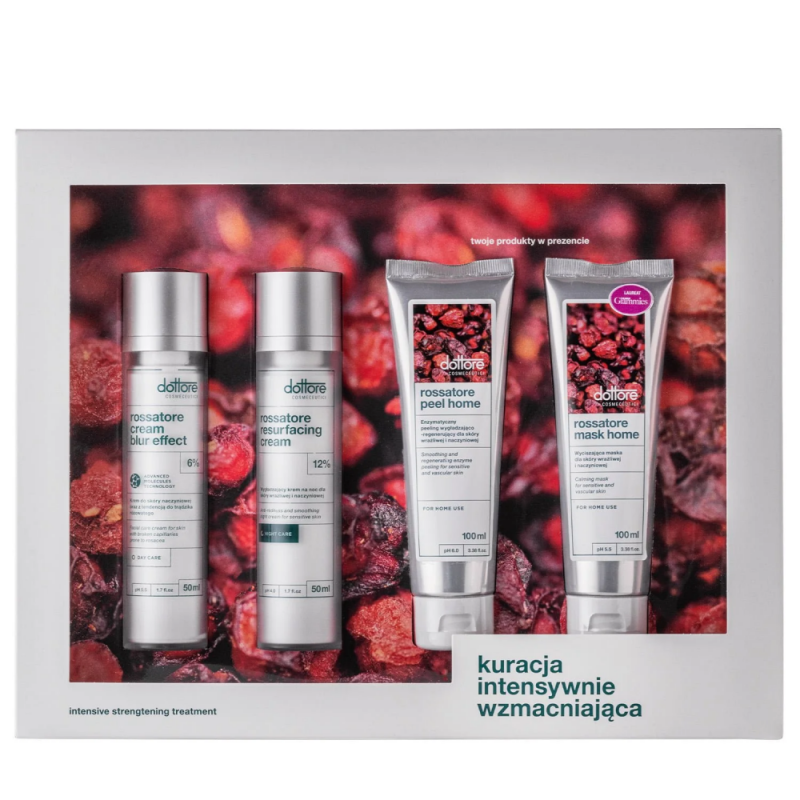 Dottore Rossatore Kuracja intensywnie wzmacniająca to zestaw preparatów do pielęgnacji skóry wrażliwej, naczyniowej z tendencją do trądziku różowatego. Cztery różne produkty przede wszystkim odpowiednio oczyszczą skórę, wyrównają poziom nawilżenia oraz zadbają o wszelkie potrzeby cery wrażliwej i naczyniowej. Dottore Rossatore Cream Blur Effect wzmocni naczynia krwionośne, zredukuje ich widoczność oraz wyrówna koloryt skóry. Dottore Rossatore Resurfacing Cream w porze nocnej uzupełni działanie kremu na dzień wydłużając uzyskane efekty. Cały zabieg dopełnią maska z peelingiem.