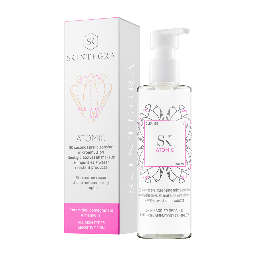 Stworzony jako idealny produkt do wstępnego oczyszczania dla potrzeb najbardziej wrażliwej skóry z zaburzoną funkcją barierową (w tym skóry z dermatoporozą), Atomic to o zoptymalizowanym pH (pH 5,5) i niezwykle delikatna mikroemulsja przeznaczona do codziennego głębokiego oczyszczania zanieczyszczenia i makijażu twarzy. Wielozadaniowy kosmetyk szybko rozpuszcza warstwy zanieczyszczeń zewnętrznych (w tym wodoodpornych) bez wysuszania, szorstkiego szorowania czy podrażniania skóry.